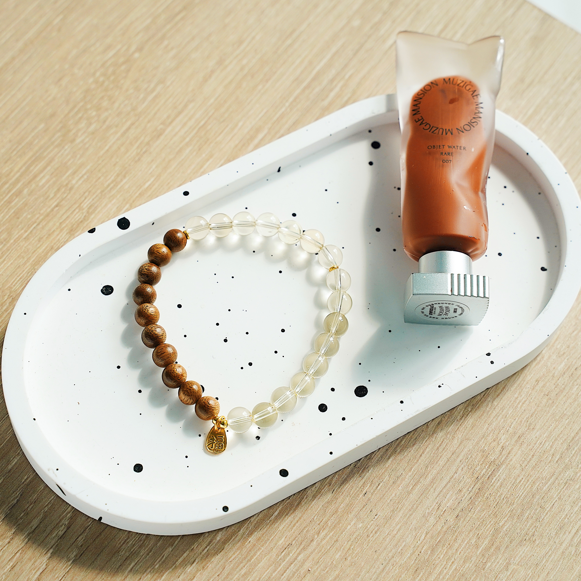 Every crystal bracelet is lovingly handcrafted using genuine agarwood and natural lemon quartz crystal. Because of the unique patterns of wood and crystal, each piece is one of a kind. Please allow 3-5 business days for your order to ship. To maintain its beauty, avoid water exposure and store in a dry place.